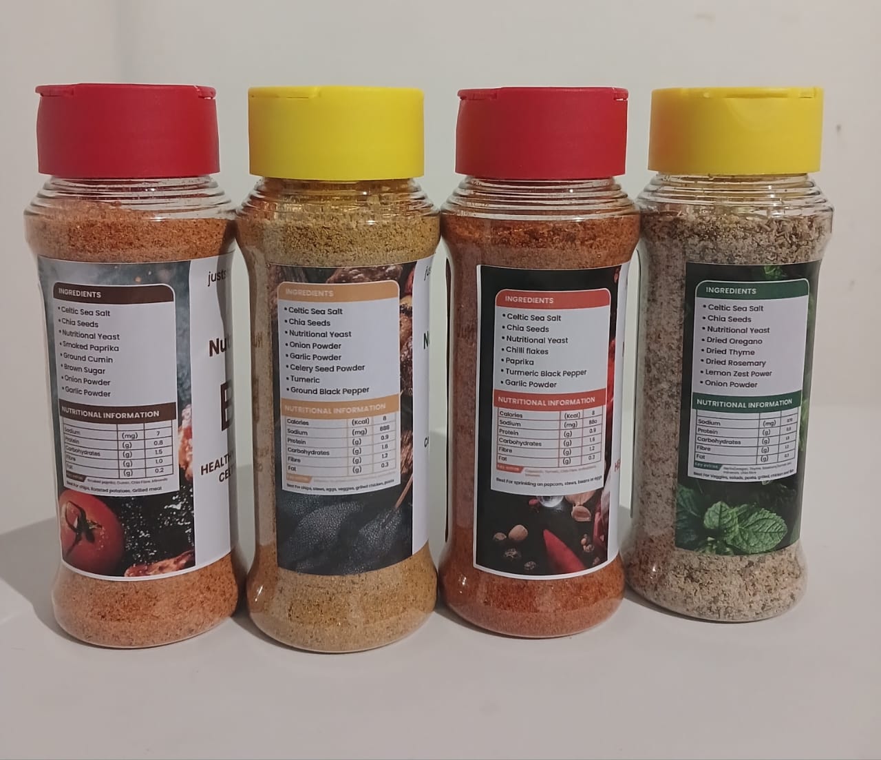 | Main Ingredients | Celtic salt, chia seeds, nutritional yeast, onion, garlic, turmeric | Celtic salt, chia seeds, smoked paprika, cumin, garlic | Celtic salt, chia seeds, chili flakes, paprika, turmeric, garlic | Celtic salt, chia seeds, oregano, thyme, rosemary, lemon zest |